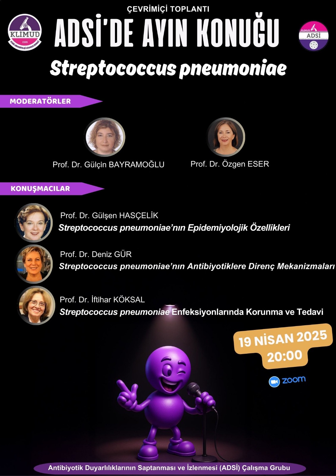 Derneğimiz Antibiyotik Duyarlılıklarının Saptanması ve İzlenmesi Çalışma Grubu (ADSİ ÇG) tarafından 19 Nisan 2025 tarihinde çevrimiçi olarak düzenlenecek olan ''ADSİ'de Ayın Konuğu: Streptococcus pneumoniae'' konulu etkinlikte siz değerli meslektaşlarımızı aramızda görmekten onur duyacağız.