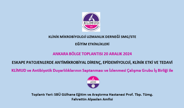 Derneğimiz Antibiyotik Duyarlılıklarının Saptanması ve İzlenmesi Çalışma Grubu (ADSİ ÇG) tarafından tarafından 20 Aralık 2024 tarihinde düzenlenecek olan '' ESCAPE Patojenlerde Antimikrobiyal Direnç, Epidemiyoloji,Klinik Etki ve Tedavi " konulu KLİMUD STE/SMG Etkinlikleri kapsamındaki Ankara Bölge Toplantısı SBÜ Gülhane Eğitim ve Araştırma Hastanesi Tıbbi Mikrobiyoloji Kliniği işbirliğinde yapılacaktır.