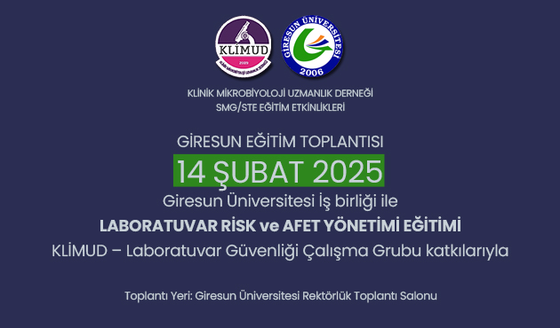 Derneğimiz Laboratuvar Güvenliği Çalışma Grubu (LG ÇG) tarafından tarafından 14 Şubat 2025 tarihinde düzenlenecek olan '' Laboratuvar Risk ve Afet Yönetimi Eğitimi " konulu KLİMUD STE/SMG Etkinlikleri kapsamındaki toplantımız Giresun Üniversitesi Tıbbi Mikrobiyoloji Anabilim Dalı işbirliğinde yapılacaktır.