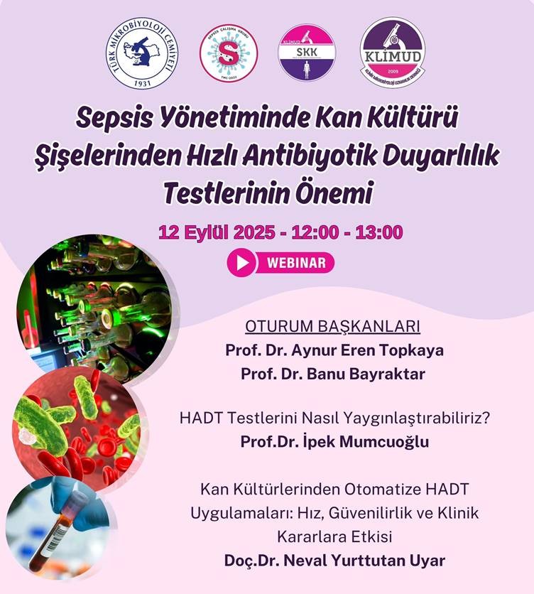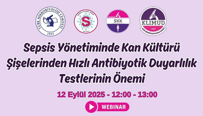 Türk Mikrobiyoloji Cemiyeti Sepsis Çalışma Grubu ve KLİMUD Sepsis ve Kan Kültürü Çalışma Grubu tarafından düzenlenecek olan “Sepsis Yönetiminde Kan Kültürü Şişelerinden Hızlı Antibiyotik Duyarlılık Testlerinin Önemi” başlıklı etkinliğimiz 12 Eylül 2025 saat 12:00 de gerçekleştirilecektir.